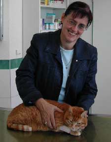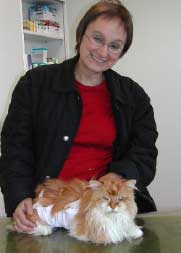 Ganz unglücklich hingegen wurde uns „Pong“ ,der dreijährige Kater der Familie Naumann, vorgestellt. Der Arme konnte schon 24 Stunden keinen Urin absetzen, weil seine Harnröhre mit Grieß verstopft war. Mein Frauchen, Dr. Rummel, hat ihm geholfen und er wurde stationär aufgenommen. Nun ist er wieder fit, aber er muss seine Ernährung komplett umstellen!