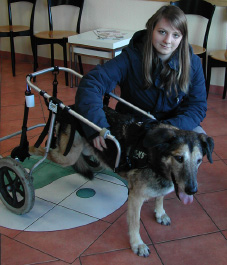 Die 12-jährige Dame hat leider eine degenerative Erkrankung des Rückenmarks (Cauda Equina) und schleift deswegen die Hinterläufe – aber sie besitzt einen wunderbaren „Wagen“, mit dem sie sehr gut klarkommt und der ihr weiterhin laufen, Spaziergänge und Spaß ermöglicht! Wirklich klasse wie sie das macht, das hat mich sehr beeindruckt!