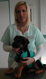 „Arkus“ ist ein Schäferhundwelpe, der bei uns am Nabelbruch operiert wurde. Der kleine Kerl war zur Freude seines Besitzers, Herrn Hohn, ganz schnell wieder wach und wird hier von unserer Praktikantin Conny gehalten. Nun geht es nach der Operation nach Hause.