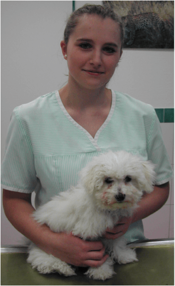 Der kleine Whisky ein Bichon frise Rüde von Frau Braumann, hier auf dem Arm von Jessica, startet gut geschützt durch die Impfungen so langsam ins Erwachsenwerden.