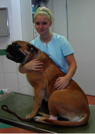 Aber auch der Bullmastiff „Carinyo“ von Familie Klein ist beeindruckend. Er hatte ein Problem mit seinem Knie, aber mein Frauchen hat ihm schnell die Schmerzen genommen, sodass er jetzt wieder lahmheitsfrei laufen kann.