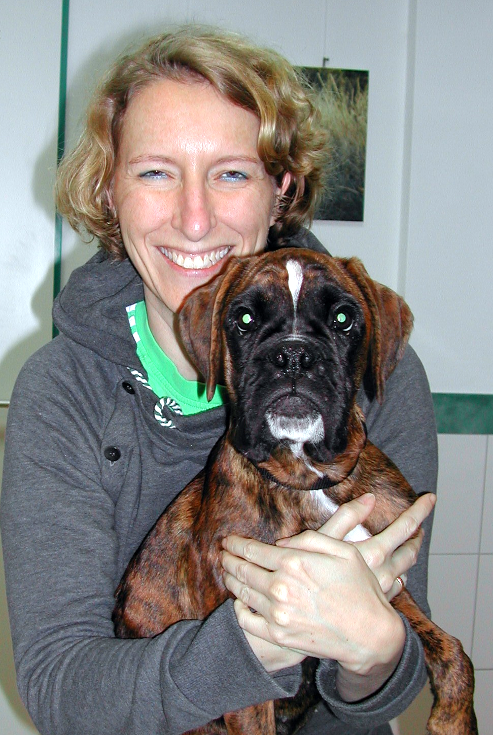 Familie Weber stellte uns ihre 4 Monate alte Boxerdame „Peggy“ zur Impfung vor – wir lieben es, eine Haustierarztpraxis zu sein und unsere Patienten ein Leben lang zu begleiten – schon in wenigen Wochen wird Peggy doppelt so groß sein ! Die Vorgängerin Unique von Peggy hatten wir auch schon jahrelang betreut.