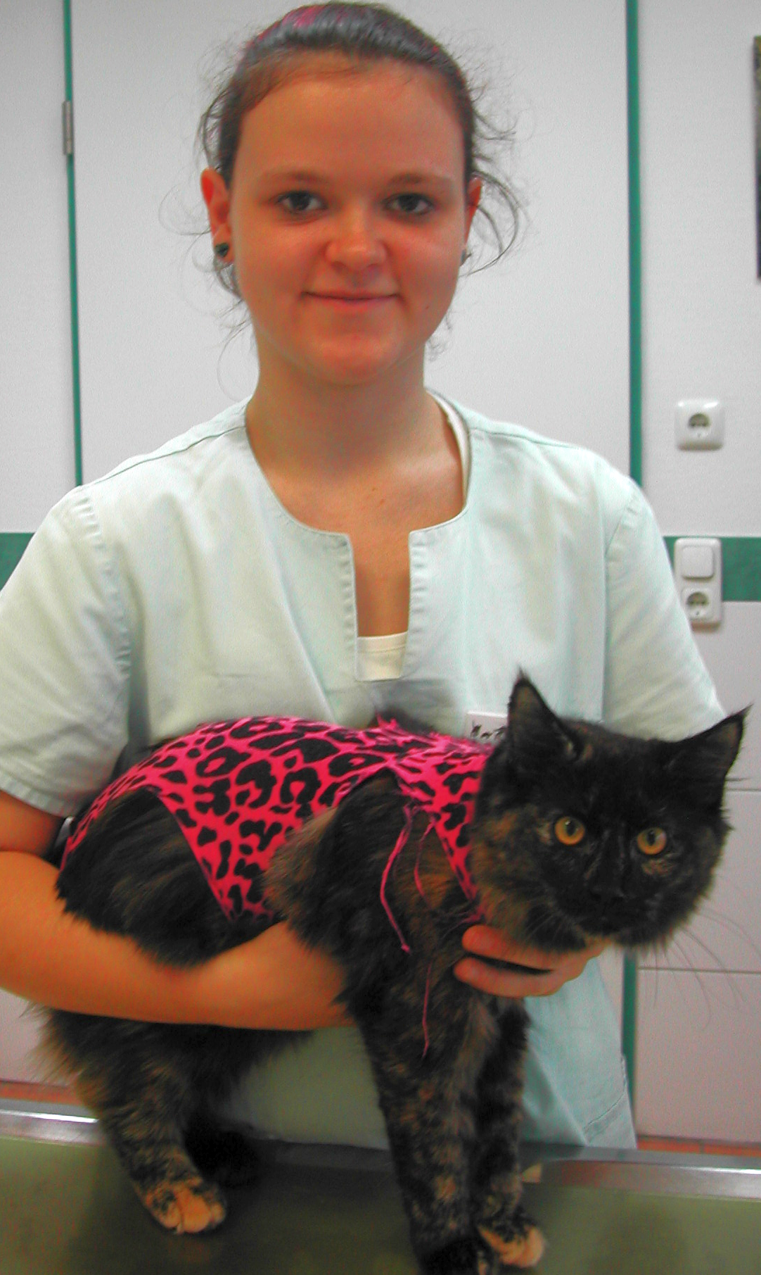 Ganz schick im Leopardenbody stellte sich „Tabby“, die Maincoonmixdame der Familie Pfeifer, zum Fäden ziehen vor. Die Kätzin war bei uns kastriert worden und hat alles sehr gut überstanden.