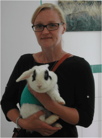 Das kleine Pünktchen , das Kaninchen von Frau Lieberam, hatte die gleiche Krankheit, auch sie wurde wegen einer Pyometra operiert. Am nächsten Tag waren beide Patienten wieder toppfit – und beiden sehen sehr schick aus in ihren turkisfarbenen Bodys.