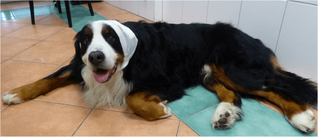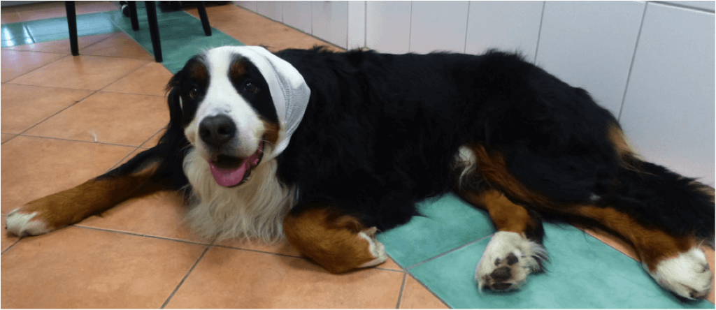 Der Kopfverband verhindert das Schütteln – doch ganz so einverstanden scheint Gismo damit nicht zu sein. Zum Glück kann der Verband wenige Stunden nach der Operation abgenommen werden, das wird Gismo gefallen.