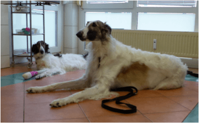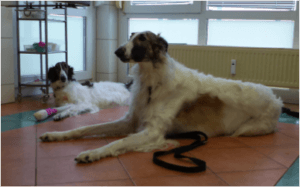 So kamen zur Kontrolle der junge Barsoi Torres von Frau Schrade, russischer Adel und schon Sieger in der Jugendklasse und seine Begleitung Nessa –