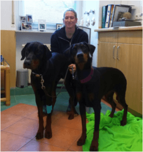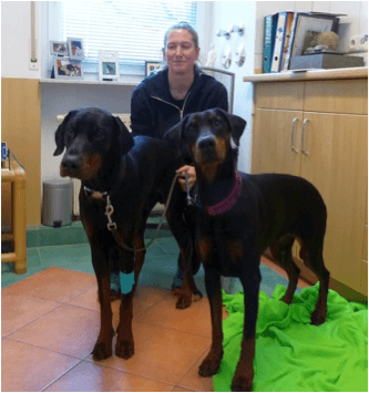 und Frau Gruner mit ihren beiden Dobermann-Hunden Bonja und Ben.