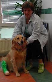 „Aisha“ ,die Golden Retriever Hündin der Familie Link, fand ich mit unseren neuen Musterverbänden sehr schick! Die Arme musste am Knie operiert werden, weil die Kreuzbänder gerissen waren!