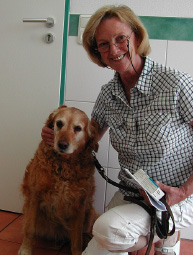 Frau Schwarz hat uns „Sherry“, ihre inzwischen10-jährige Golden Retrieverhündin vorgestellt – bei ihr hat Dr. Rogalla im Jahr 2000! eine Goldimplantation wegen beidseitiger Hüftgelenksdysplasie als Jugendprophylaxe durchgeführt und sie läuft bis jetzt wunderbar ohne Gabe von Schmerzmitteln trotz der starken Hüftarthrose! Das fand ich wirklich beeindruckend!