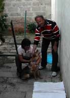 In den Ortschaften sieht man ja viele Hunde, die keine Besitzer haben und meine Frauchen haben mir erklärt, dass leider in den südlichen Ländern viele Tiere herrenlos sind und ausgesetzt werden. Allerdings werden die Hunde in den Gemeinden von der Kommune gefüttert, die weiblichen Tiere werden kastriert und dann wieder ausgesetzt. Na ja, ich bin froh, dass ich ein schönes Zuhause habe, aber die Hunde bei uns im Ort waren gut genährt und sahen auch nicht unglücklich aus. Aber dieser Kerl saß alleine im Pinienhain ohne Wasser und Futter und schien nicht recht zu wissen, wie weiter, und bei genauerer Betrachtung stellte sich heraus dass er auch Bissverletzungen hatte. Wir haben ihn dann „Volpino“ (das ist italienisch und heißt Füchschen) getauft und ihn erst mal mit Wasser und Futter versorgt. Dann haben meine Frauchen die Wunden versorgt und ich muß sagen, das Kerlchen war sehr lieb und tapfer: er hat sich die ganze Behandlung super lieb gefallen lassen und hat sich dann noch ganz brav das alte Fell ausbürsten lassen! Ich persönlich kann Bürsten ja gar nicht leiden, aber „Volpino“ hat auch keine Locken und dann ist es bestimmt viel einfacher!