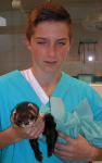 Das kleine Frettchen „Stinker“ von Familie Theilmann machte unserem Schülerpraktikanten Paul viel Spaß. Auf seinem Arm erwacht es gerade aus der Narkose, ein Tumor auf dem Rücken musste operiert werden.