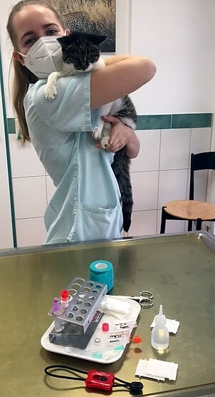 Lucky (hier mit Sara), die 17-jährige Katze von Frau Brodt, gehört zu unseren Seniorpatienten und hat inzwischen einige Erkrankungen, aber immer noch dank optimaler Unterstützung durch ihr Frauchen und sehr guter medizinischer Betreuung durch uns eine sehr gute Lebensqualität. Hervorgerufen durch ihre chronische Niereninsuffizienz litt sie aktuell an einer deutlichen Anämie (Blutarmut).