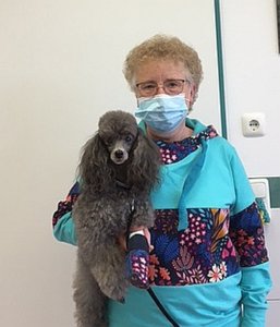 Sandy, die Zwergpudeldame von Frau Wagner, hatte eine Zubildung im Zwischenzehenbereich. Frau Dr. Rogalla entfernte den Tumor und leider stellte sich bei der pathologisch-histologischen Untersuchung heraus, dass es sich um einen bösartigen Mastzelltumor handelte. Nun trägt Sandy sehr schicke Socken- man beachte, dass sie zu Frauchens outfit passen – um die Wundnaht zu schützen, und wir alle drücken Sandy die Daumen, dass es zu keinem Rezidiv kommt.
