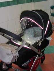 Bunchy“, der Havaneserrüden von Frau Schendzielorz, der zur Kastration bei uns war, wird hingegen mit einem gemütlichen Kinderwagen abgeholt, geschützt gegen Wind und Wetter, hat er sich eingekuschelt.