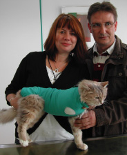 „Kyra“, die siebenjährige Türkisch Angora Mixkatze der Familie Kordts, wurde uns neu vorgestellt, weil sie schon lange ein gelähmtes Vorderbeinchen hatte, das immer wieder verletzt war, weil es über den Boden streifte. Wir rieten dringend zur Amputation, um die ständigen Verletzungen zu vermeiden. Das ist immer eine schwere Entscheidung, doch nach der gelungener Operation durch Dr. Rogalla und einem kurzen stationären Aufenthalt, war Familie Kordts sehr glücklich, Kyra wieder mit nach Hause nehmen zu dürfen. Kyra konnte auch schon schnell und wendig auf drei Beinen laufen, ist das Fell erst wieder nachgewachsen, wird man der Kleinen gar nicht mehr anmerken, dass ein Vorderbein fehlt, unsere Stubentiger kompensieren das schnell und problemlos.
