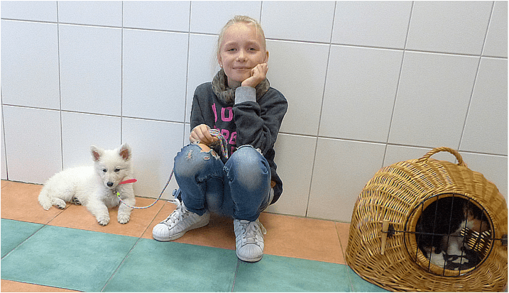 Familie Prinz stellte uns ihr neues Familienmitglied vor: Eira – ein total süßer, weißer Schäferhundwelpe –und nach gründlicher Allgemeinuntersuchung hatte die kleine Dame ihren ersten Gesundheitscheck bravourös überstanden. Sie war in Begleitung der Katze Pepper – sitzt im Korb, die regelmäßig wegen Schmerzen zur Akupunktur kommt (s. Septemberstory).