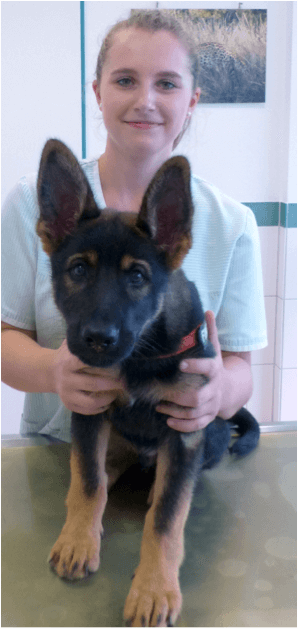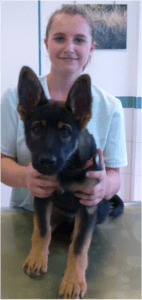 Auch Luni, der noch kleine Deutsche Schäferhund von Familie Oswald im Arm von Jessy kam zur Impfung und man sieht ihm an, dass er noch Großes vorhat.