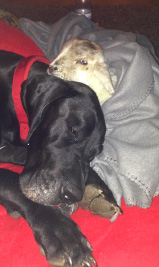 Da es den ersten Lebenstag in der Praxis verbracht hat und sich dort wie zuhause fühlte und daheim aufwächst mit Hunden, fand es natürlich die Hunde im Wartezimmer klasse. Diese waren aber baff erstaunt über diesen langbeinigen stupsenden „Hund“ und wussten nicht so recht, wie nun damit umzugehen!