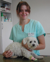 Frau Seel stellte uns ihren Bolonka Zwetna Rüden „Leo“ vor, der ein Problem mit der Kniescheibe hat (Patella Luxation rechts nach lateral) und deswegen eine Spritzkur zur Festigung des Bandapparates erhielt.