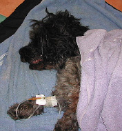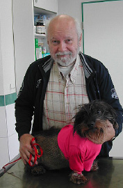 Auch bei „Alf“, dem Rauhhaardackelrüden von Herrn Deil musste Dr. Rogalla einen gutartigen, apfelsinen großen Tumor aus der Oberarmmuskulatur entfernen. Die Operation ist erfolgreich verlaufen und zu den Kontrollbesuchen hatten wir eine kleine Modenschau mit täglich wechselnden T-Shirts und einem stets gutgelaunten „Alf“.
